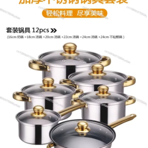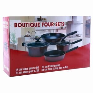 Во комплетот добивате: 18cm сад за готвење со стаклен поклопец, 24cm тава за пржење, 24cm сад за готвење и 30cm длабок сад за готвење со стаклен поклопец.
