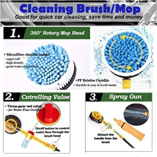 Одличната особина на оваа четка е нејзината ротирачка функција. Со вградени ротирачки механизми, оваа четка може да се врти со голема брзина, што овозможува длабинско и ефикасно перење на вашето возило. Не само што ќе го отстраните секој прашок и мрс, туку и ќе го добиете сјајот и блескавицата на вашата каросерија.